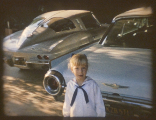 A young Jennifer in the Sparks' home carport, along with some magnificent automobiles. Circa 1965