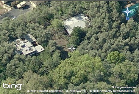 This small 875 square foot dwelling is perched 10 - 15 ft above the ground on a square patterned masonry block plinth, and 3 massive angled steel beams. Most of wall space is windows. The elevated platform allows for a view in the oak trees surrounding the site while ensuring privacy within.